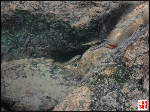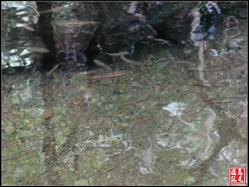 步道經過一處大石壁下方,溪水清澈碧綠,波光樹影,魚兒成群,小瀑水花四濺,真是清涼又消暑!
