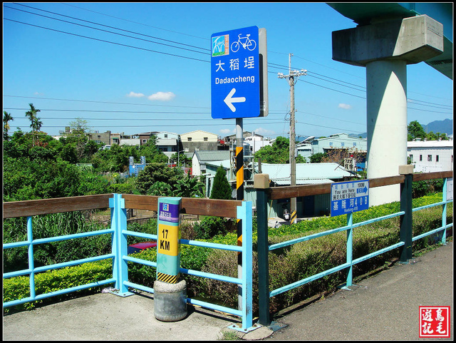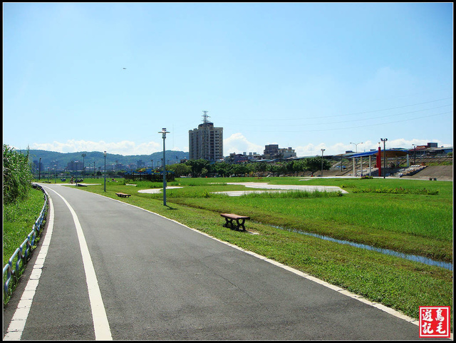 在自行車涼亭內避蔭休息一下,欣賞美麗的風光,島頭公園綠草茵茵,最前面臨河處另設有木棧觀景平台。
