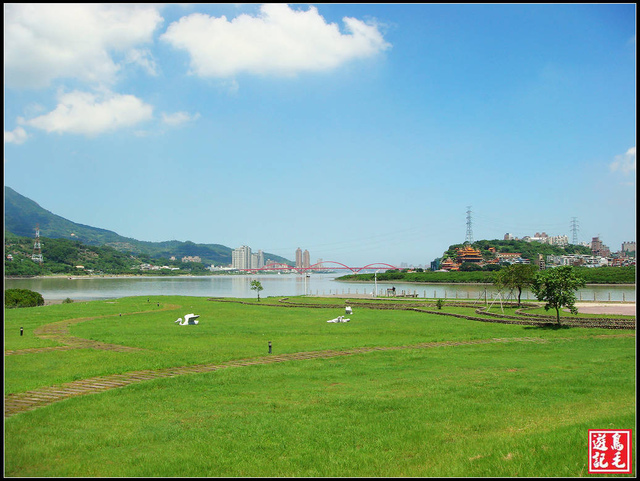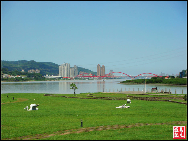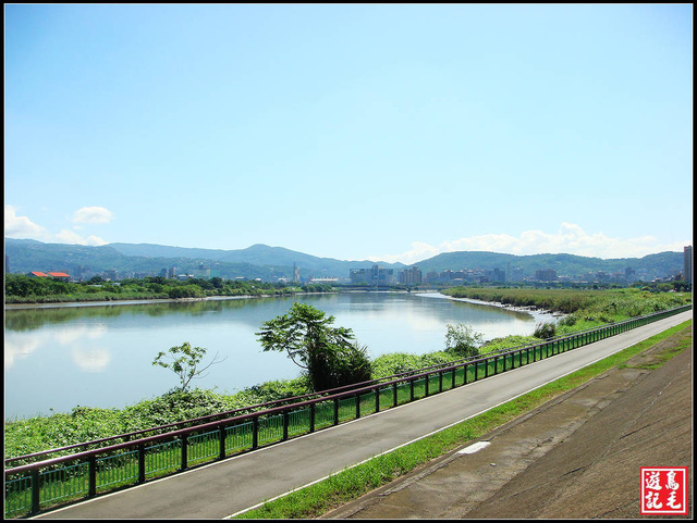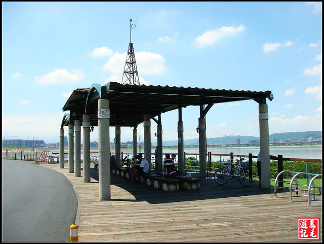 進入自行車涼亭休息站,隔著基隆河遠眺對岸的關渡宮、關渡大橋,美景盡收眼底。