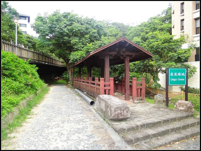 不久,公路下方叉路出現綠底白字「清溪綠地」立牌,溪旁有木造涼亭,此處就是小坑溪親水文學步道入口。