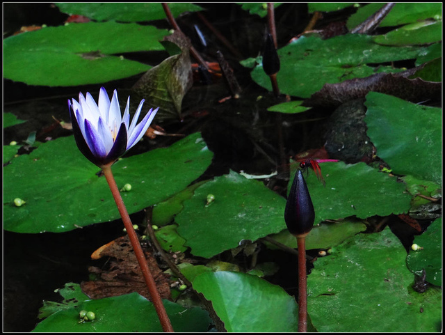 親水平台階梯,坐看睡蓮一派悠然清新,紅蜻蜓停駐其間,彷彿時光就停在這一刻。