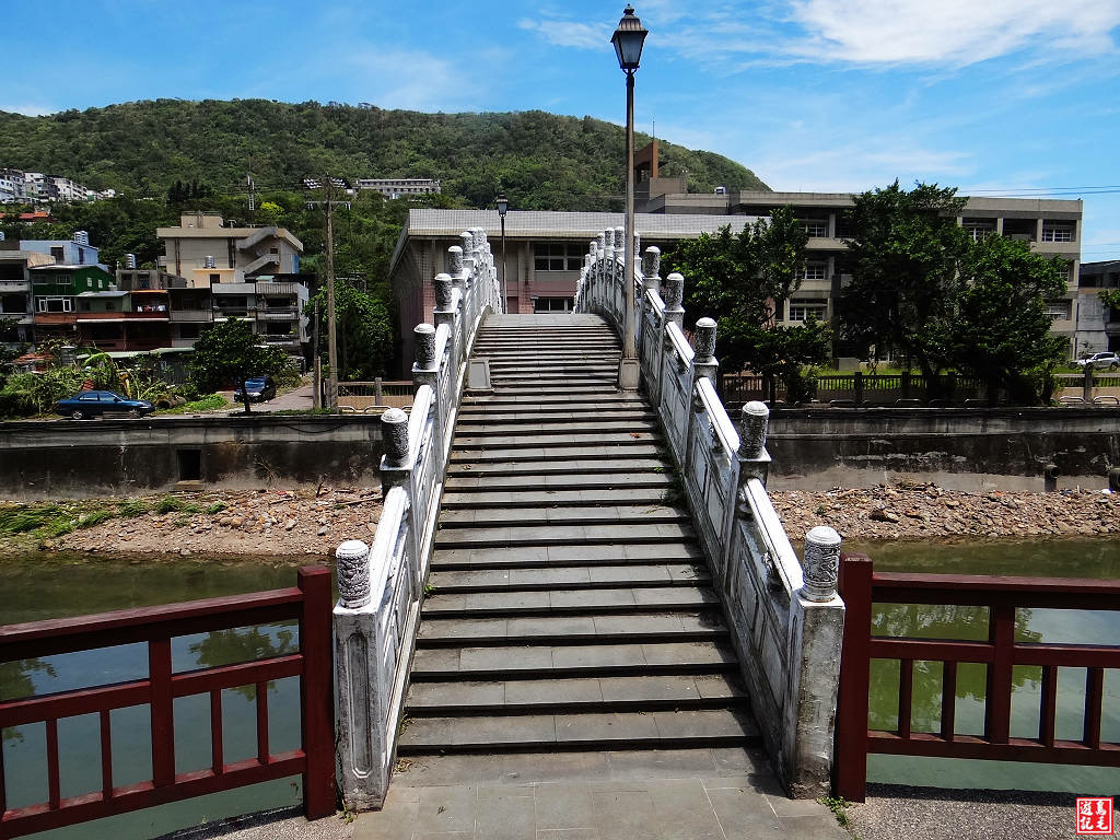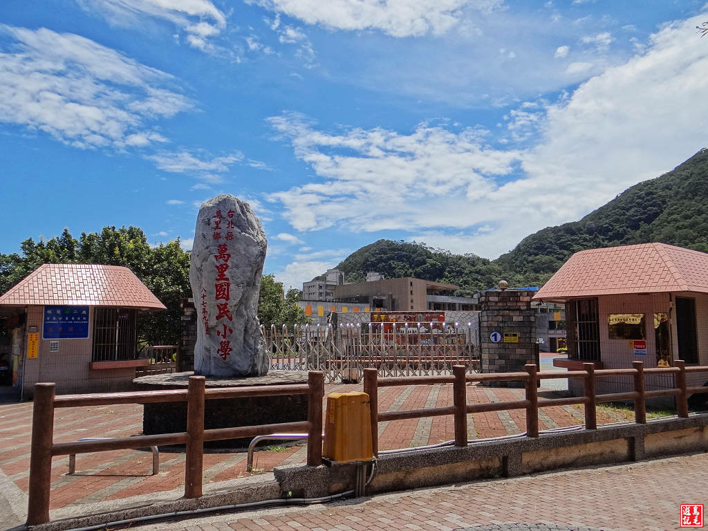 瑪鍊溪下游拱橋過去就是萬里國小,右邊山坡有階梯可至上方的觀景涼亭及運動公園。