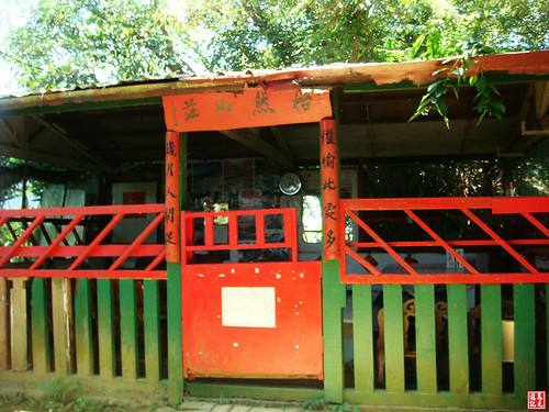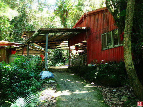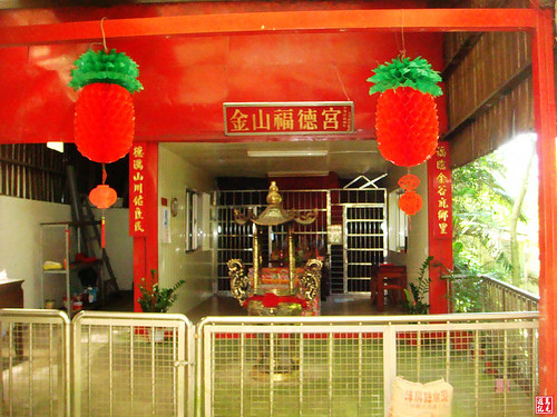 水泥小路沿著柴埕溪往上爬,途中有間紅色鐵皮屋,廟前掛著兩顆紅色鳳梨球飾,原來是間土地公廟。