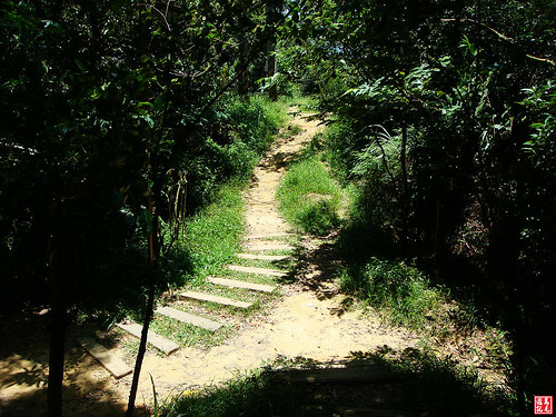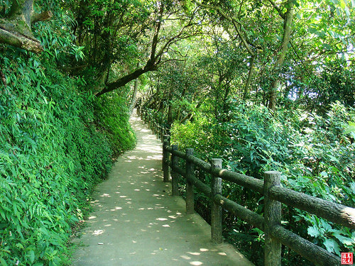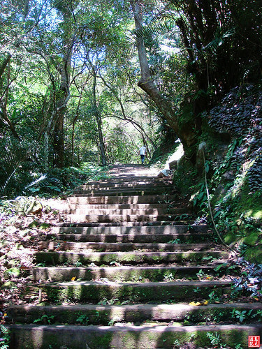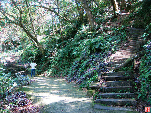 行走在步道上,感覺路況甚佳,續爬上一小段水泥階梯後到達山友休息站,取右側小路續行。