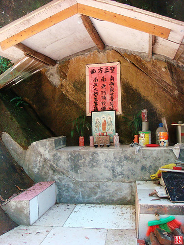 水泥路盡,鋪上寬大的枕木階梯步道,綠蔭樹下十分空曠而清幽,步道右側岩壁下方供奉--西方三聖:南無觀世音菩薩、南無阿彌陀佛及南無大勢至菩薩。