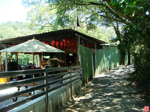 至叉路有家不甚起眼的卡拉OK小吃店及魚池,右側叉路往前幾公尺後無路,退回取左路沿溪而行,路底有小停車場,越過小溪開始起登。