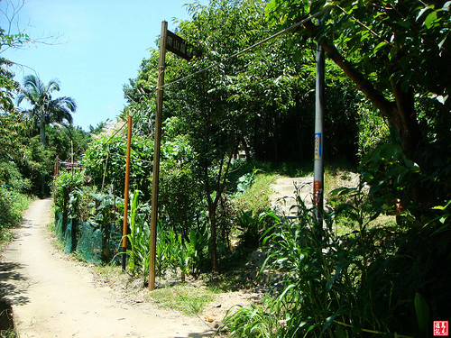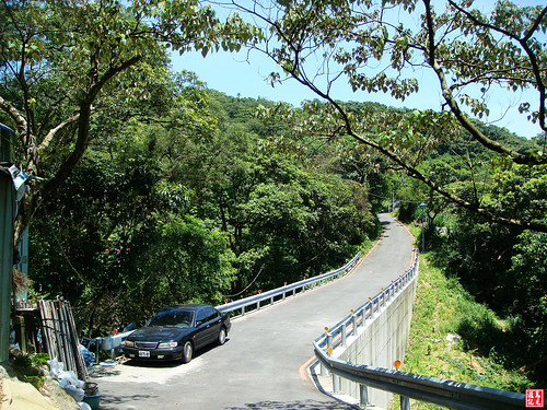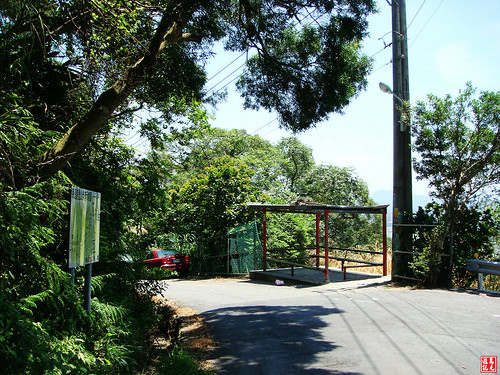 山稜線上寬大的柏油產業道路無遮蔭,烈日當空,撐傘遮陽,附近有幾戶民宅、命相館,至叉路有簡易涼亭,視野不錯,休息一下看風景。