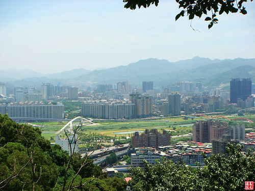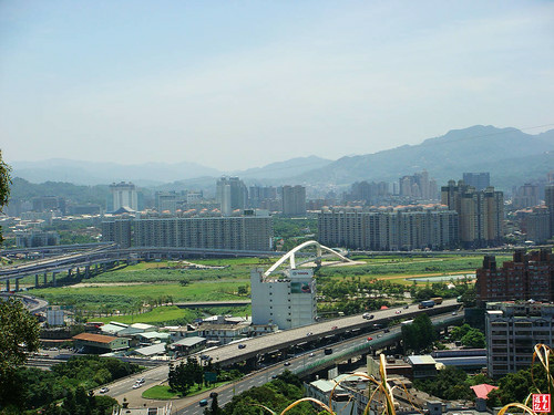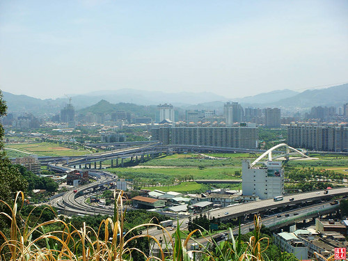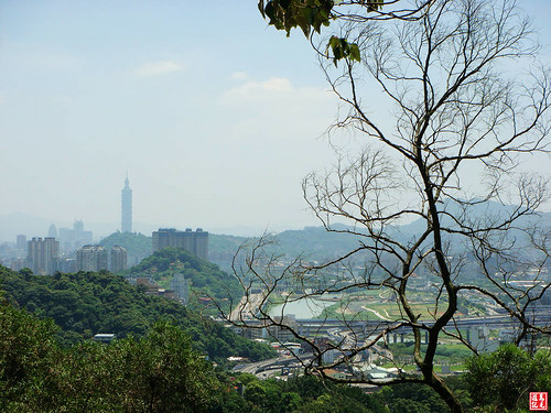 從旨安宮的綠色鐵皮旁水泥路出來接柏油產業道路,山谷下方可望見遠處的台北101及新店的陽光運動公園。
