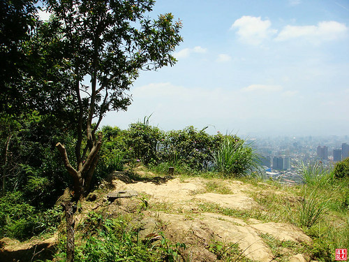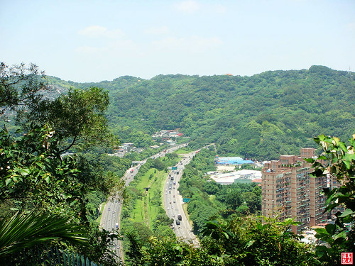 石階陡上後到達一處小公園,花木扶疏,視野不錯,往下可俯瞰北二高車流,往左邊的水泥小路直行,再依指標取右往南山福德宮方向。
