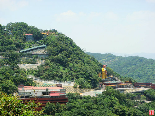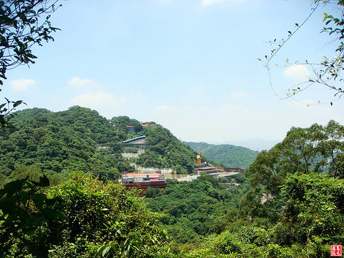 在稜線步道上,望向對面的南山福德宮,廟宇輝煌,依山而建,雄偉壯觀,土地公金身右手持拐杖左手握元寶,昂然佇立在山腰上。