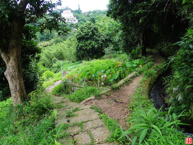 取原路再回狗殷勤水圳步道,望見山谷之間菜園、梯田,有花崗石階步道叉路左下,可截彎取直先下後上至對面接水圳路,但因少有人走已顯荒蕪,不取。
