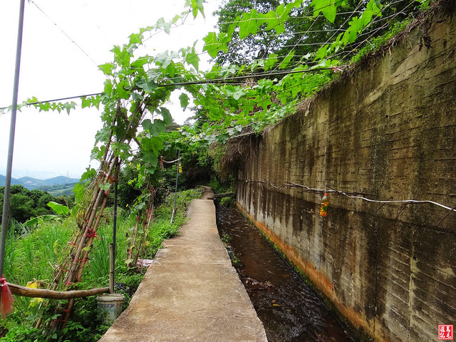 續直行水圳路,腰繞山谷經過絲瓜棚架,這段水圳旁步道已施作水泥,路右下方有叉路來會,應該就是剛才左下截彎取直的路線。