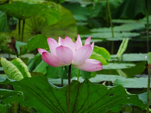 放眼望去,諾大的荷花池,滿池都是寬大的荷葉,點綴著粉紅的朵朵荷花,午後的微風吹來,也夠美的。