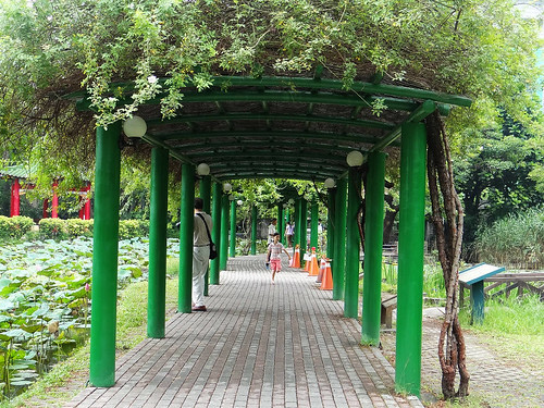 從賞荷廣場木棧平台沿著環池步道,繞往博愛涼亭方向,花架拱廊下,小朋友無憂無慮,開心地奔跑嬉戲。