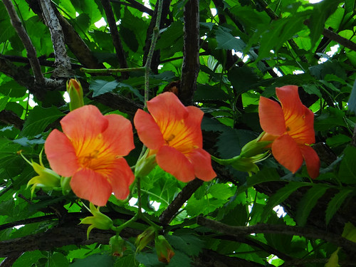 凌宵花落落大方,雍容華貴,盛開在高高的花架上。