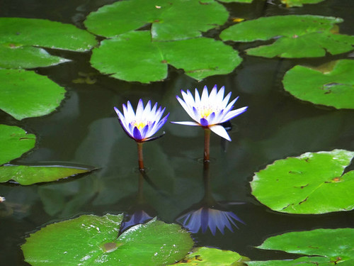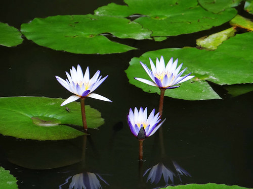 葉子飄浮在水面上的是睡蓮(香水蓮),花朵挺出水面上,花瓣倒映池面,散發濃郁的香氣。