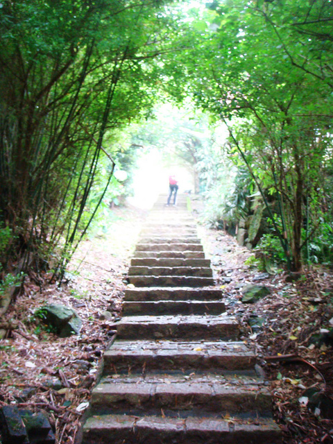 陡上的花崗石階梯,兩旁綠竹交擁夾道,儼然綠色隧道,天空飄下細雨,乍現皓光,又數十階,到達上方愛富三街登山口。