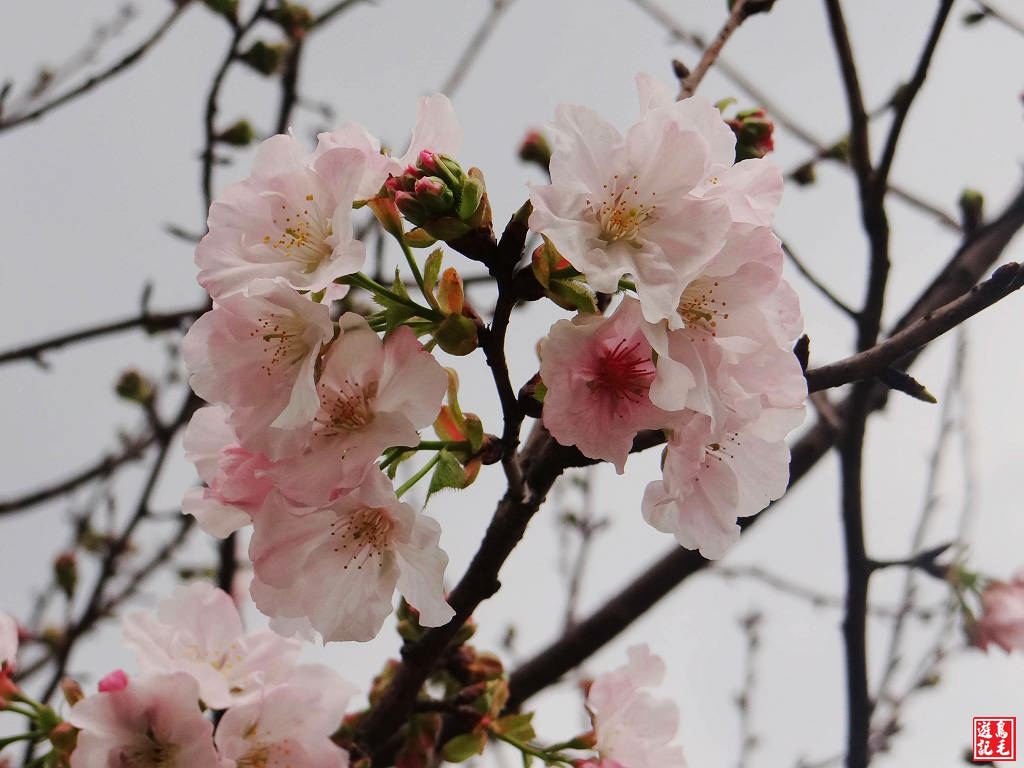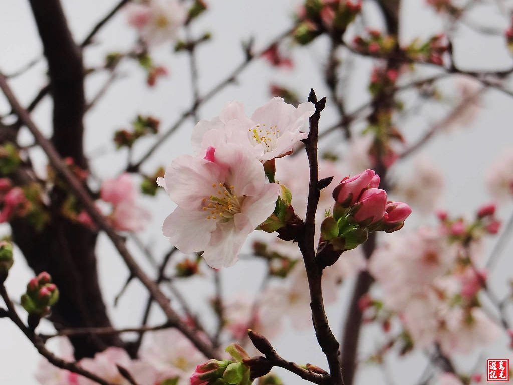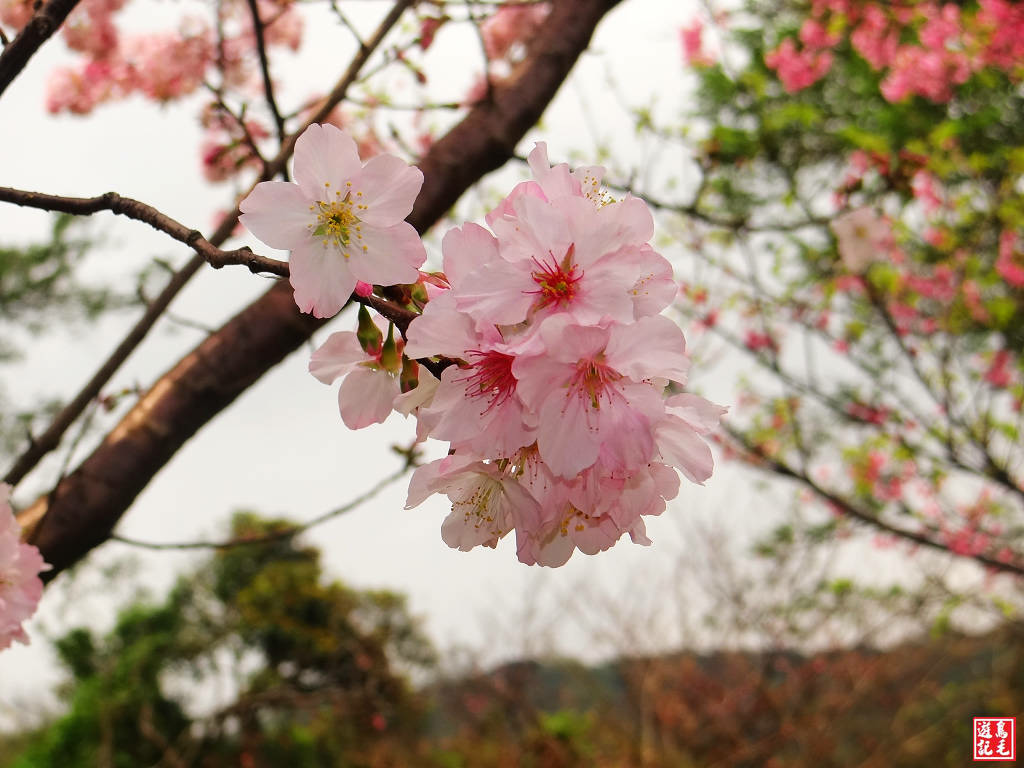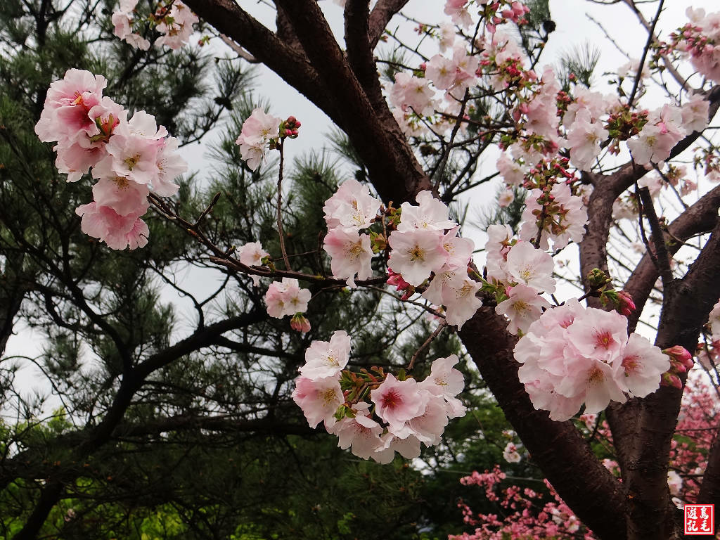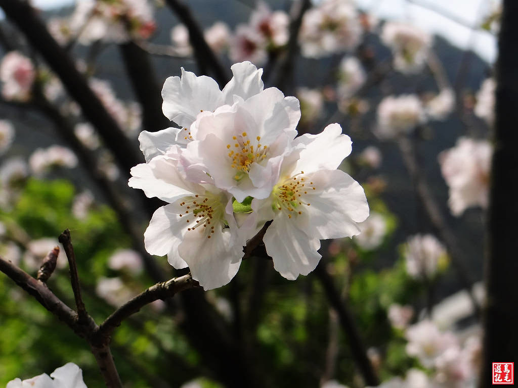 艷陽高照 妳的粉白 花心略帶淺粉紅 吉野櫻花形較大 花朵叢集 好戲壓軸意謂大器晚成嗎