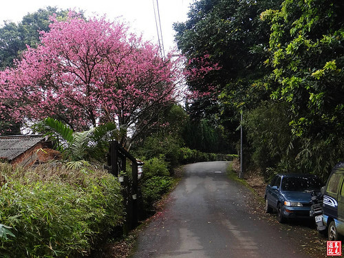 古道從菁山路99巷上來 柏油路 櫻花粉紅多姿 左出101巷9弄