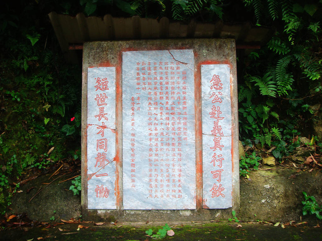 叉路旁有小粗坑發電廠設置紀念碑,急公赴義其行可欽,經世長才同聲一慟,用以紀念民國40年12月間副工程師王君聯治因變電站發火故障,