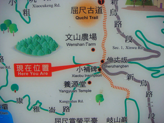 水泥階梯上來,旁邊是永興路135-1號,附近就是伸丈坂公路站牌及文山農場叉路,據說「伸丈坂」是來自日語的翻譯。此處是屈尺古道的最高點,