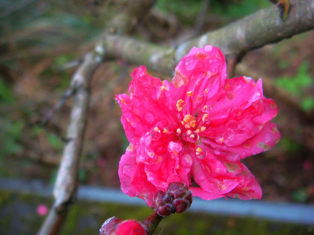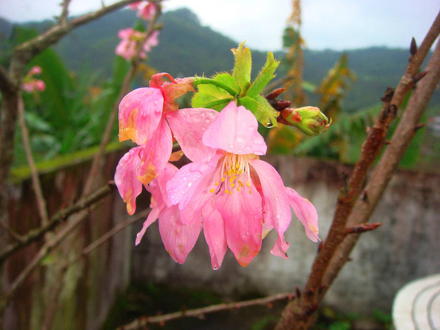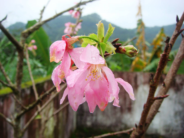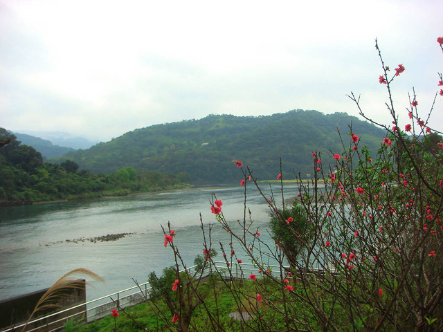 臨別屈尺壩,回望杏花點點朱紅,在溪畔迎風搖曳,花隨風雨飄搖朦朧之中,視線已逐漸迷離模糊。