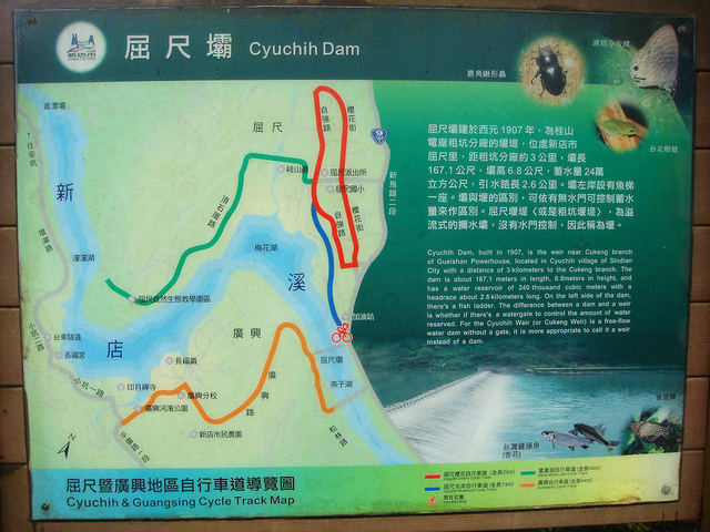 屈尺水岸自行車道終點到達屈尺壩,引道上來又接新烏路,再往上遊則有燕子湖。