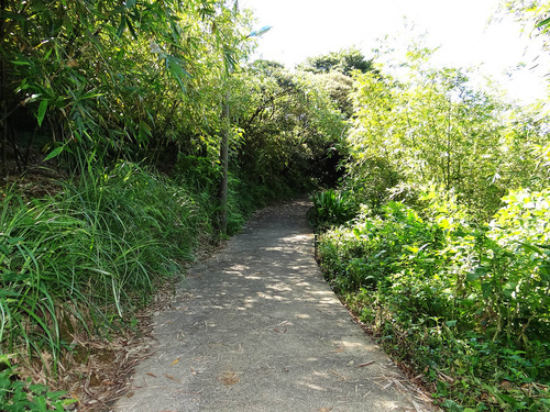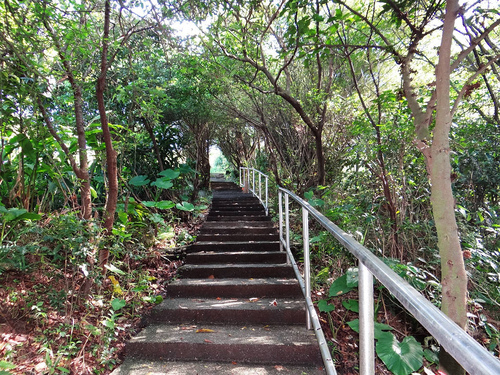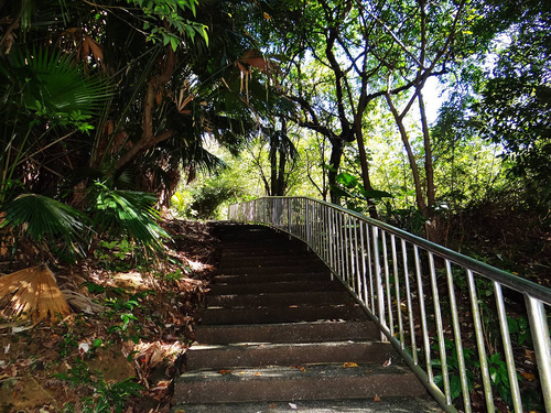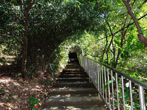 從四維荷花亭旁水泥階梯漸往上爬,有綠樹遮蔭,一早樹上蟬鳴鳥叫,精神正旺。