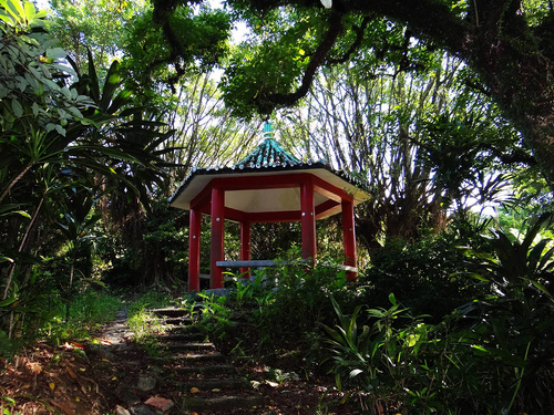 水泥階梯盡處到達上方,旁有小停車場有水泥路接上來,再往前行,有座休息涼亭,右往慈佛寺方向,