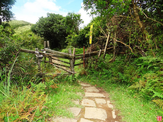 步道途中有木頭架起柵欄,防止牛隻闖越,擎天崗草原上的牛隻,都是自由自在的沒有繩索羈絆,途中回望竹篙山。