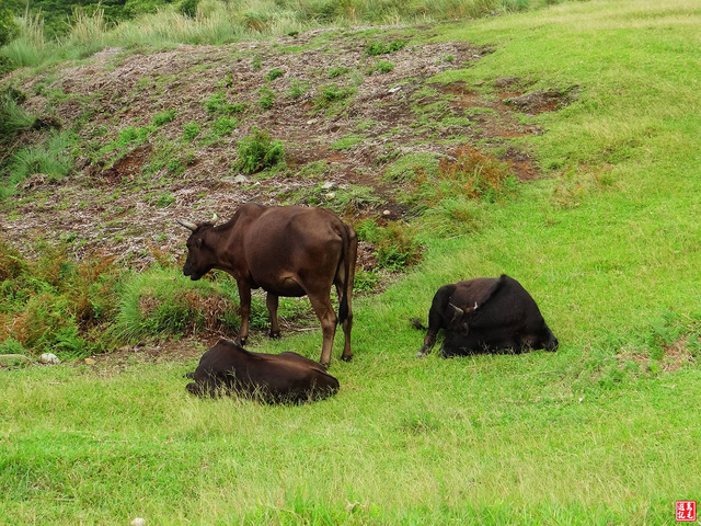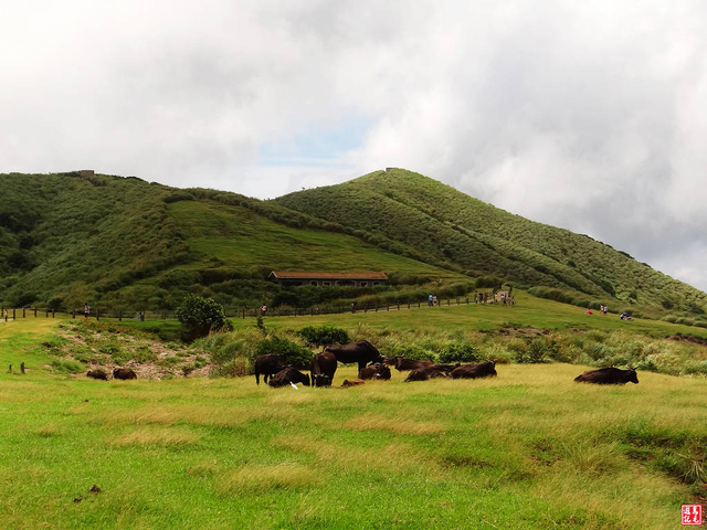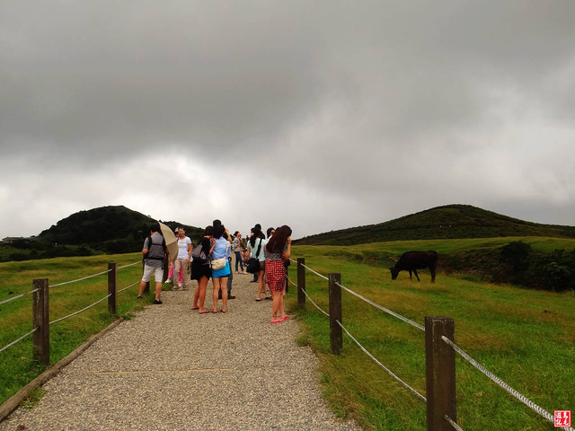 碎石步道上遊客熙來攘往,簡易的繩索護欄外牛隻成群,人們的歡笑聲此起彼落,牛隻卻安詳地吃草或休息。