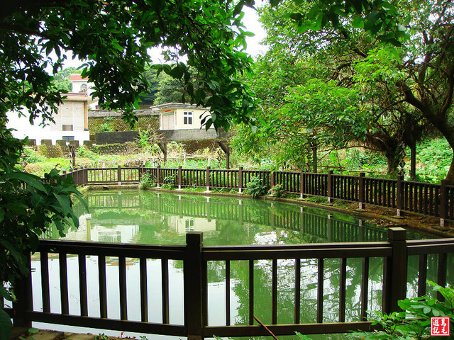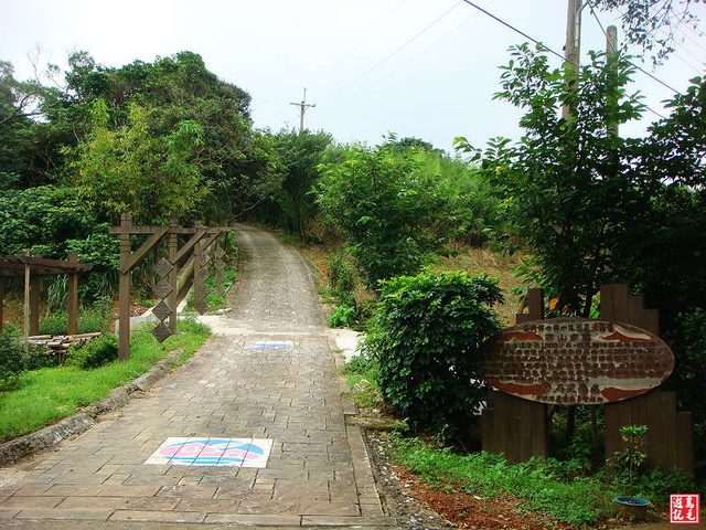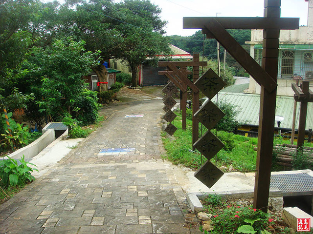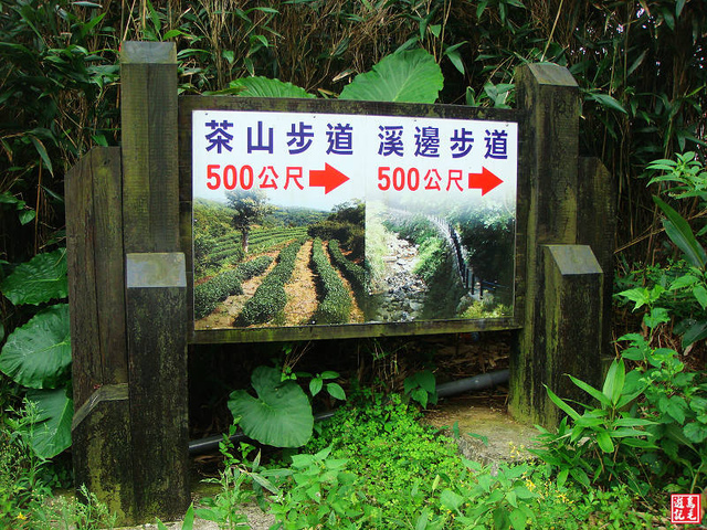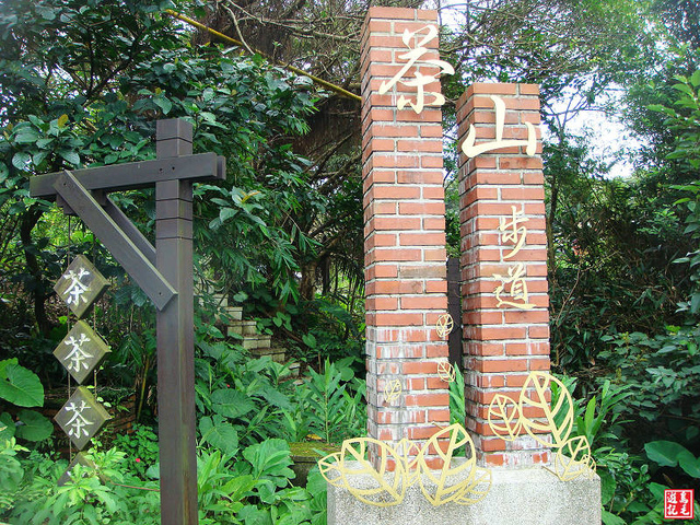 只要看到「茶、茶、茶、茶」的懸吊木牌就知道步道入口到了。茶山步道入口意象進入,旁有大水池 。