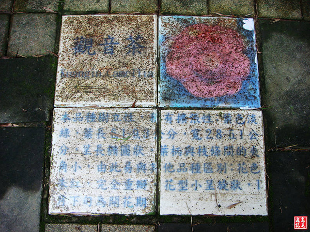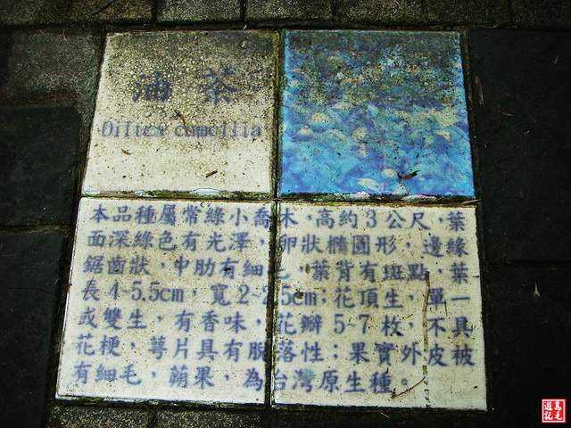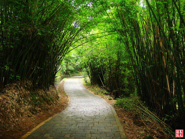 步道前段就像走在綠色隧道裡,兩旁高聳的竹林交擁遮蔭,每走一小段地上就發現有茶種介紹的磁磚,美中不足的是有點褪色模糊。