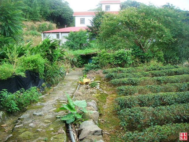山雨欲來,加快腳步返回步道口,從雲頂製茶小屋旁的駁坎階梯下來,沿著溪旁茶園走出來,接北21縣道。