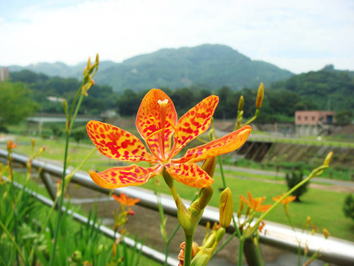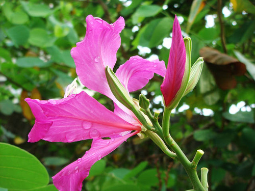 步道從景美橋下過後,旁有羊蹄甲,粉紅色的花含著水珠,鮮豔出色,羊蹄甲是因葉片形似羊蹄而名。