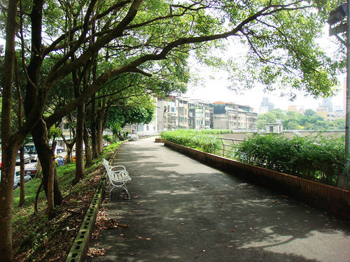 河堤步道有些地方有綠蔭,坐在椅子上休息一下,看看景美溪兩岸風光。河堤上也有些主人帶著愛犬出來溜達,因為區公所有派人定期清掃及除草,