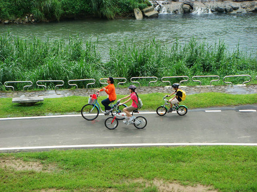 自行車道上有的三五好友並駕齊驅,也有親子家人同騎自行車,大人都讓小孩騎在前面,「讓」出於愛,出於建立小孩的信心,也為了照顧安全。
