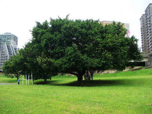 看見這片綠地花草真美麗,還有一棵超級傘狀大榕樹,我又從堤防步道走下階梯,改走自行車步道。