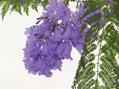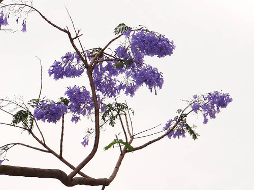 藍花楹的葉子與鳳凰木很像,都是羽狀複葉,如果沒開花,很難分辨。