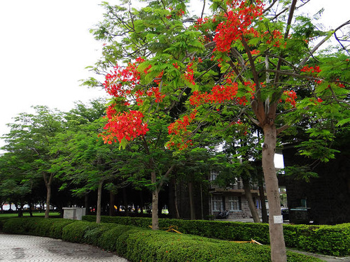 靠近校舍高大的鳳凰木樹梢已見鳳凰花鮮紅綻放,紅配綠,有夠美麗。