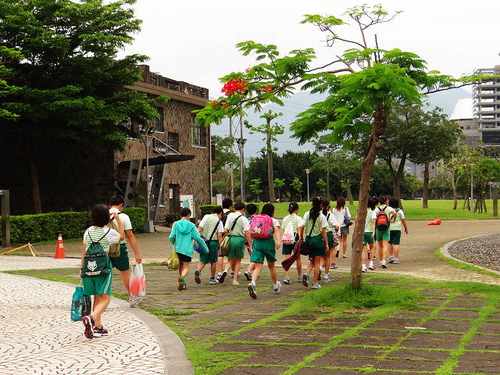幾位小學生從鳳凰木下走過,大家有說有笑,現在還是渾然不覺,他日驪歌聲起,再看鳳凰花紅,或許有不同心情。