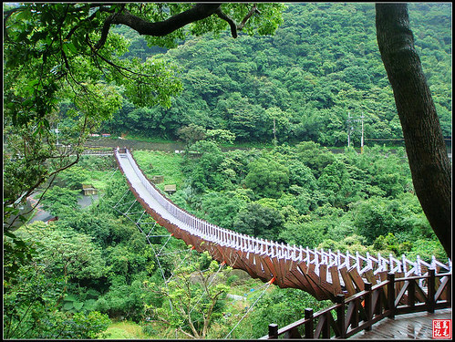 雨勢漸歇,今天沒什麼遊客,雨後山谷春色十分寧靜,眼前色彩鮮明的龍骨吊橋,懸掛在清新翠綠的山谷間,景色絕美。