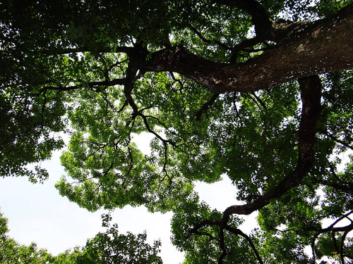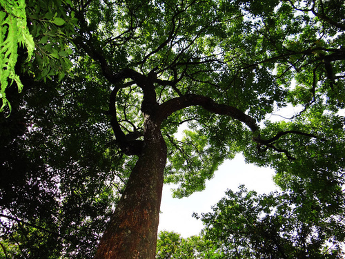 循著山坡往上爬,至樟樹崖,有棵巨大參天的樟樹,雄壯威武的俯視著爬山的遊客。再往上有右叉小路至廢棄小木屋,名為蒼松嶺。