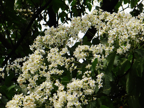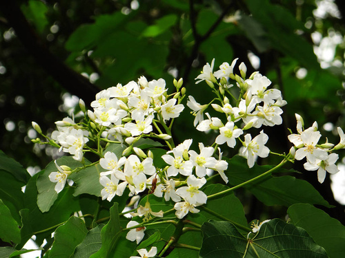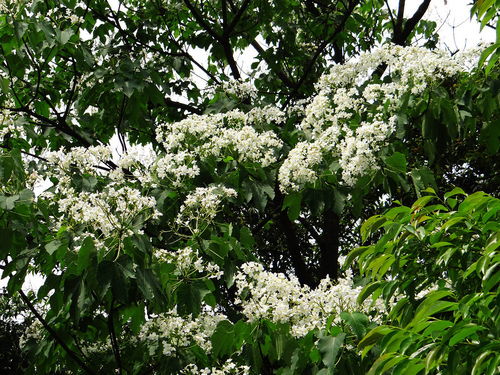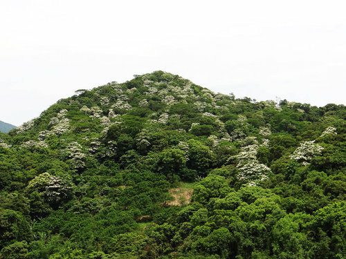 山腰空曠處可望見對面山頭綠白交錯,時植桐花盛開如瑞雪般,那便是老鷹尖,步道轉為平緩,續前行一小段之後,便抵油桐嶺了。