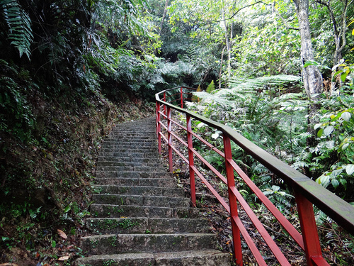 寺前平台可環顧翠綠山坡上點點雪白油桐花開,右側有紅色護欄陡上水泥階梯步道,沒發現指標,不知通往何處?爬上去瞧瞧。