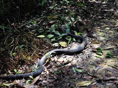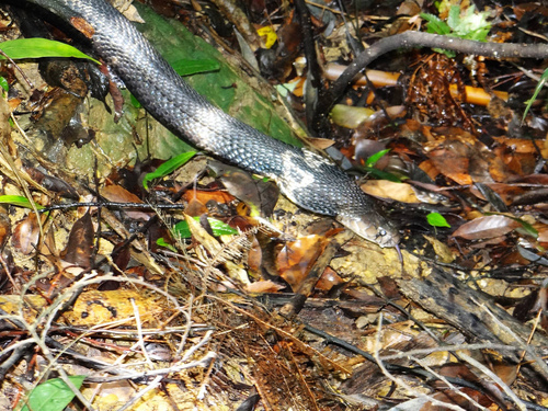 半途林蔭步道泥土路覆蓋樹葉,赫見一尾黑蛇,粗大圓滾的身體一動也不動,接近頭部的地方還扁扁的,起先已為是條被打死的蛇,