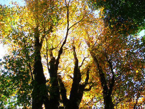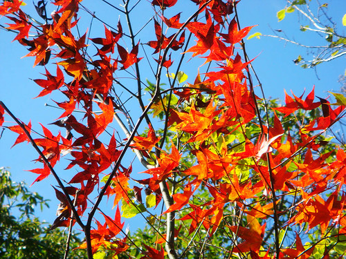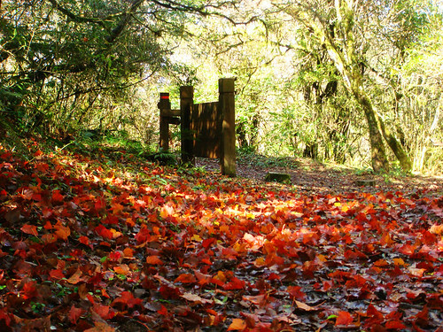 經過芒草掩道的階梯上來進入林蔭之下,路徑變寬覆滿落葉水氣未乾,抬頭仰望楓葉在陽光下,火紅的身影隨風炫耀。