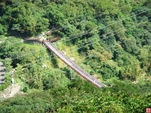 先俯瞰一下白石湖山谷景觀,再將鏡頭拉近,可見白石湖吊橋懸掛在數條電線的下方山谷之間。