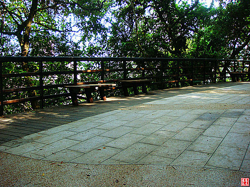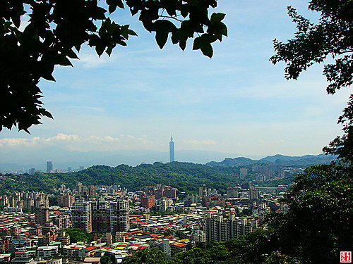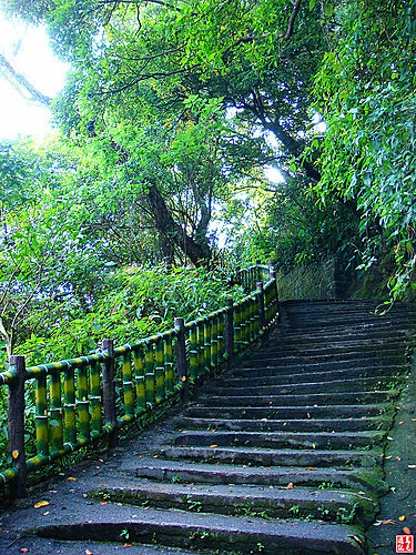 通往仙岩廟的階梯步道十分寬大,再往前行有一慈善亭,亭內享受山風吹拂涼爽無比,俯瞰景美一帶景色,遠眺台北101在山後高聳參天。