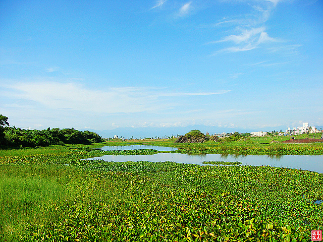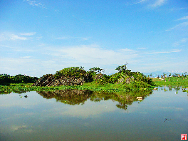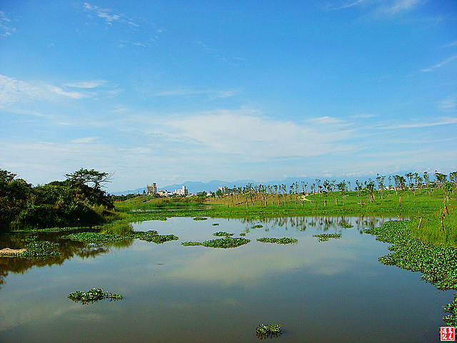 蘭博館前的沼澤溼地,將藍天白雲倒映入水面,景致渾然天成,美麗如畫。